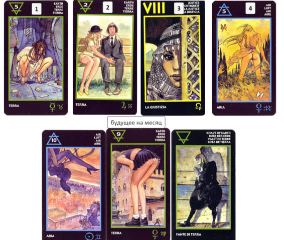 5. Будущее на месяц – 10 воздуха, 9 земли, Слуга земли. Квинт Солнце. По 10 воздуха Вы все же будете метаться между двумя партнерами, но он будет Вас терпеливо ждать. Стремление к постоянным переменам, но человека все-таки что-то держит и заставляет периодически возвращаться в старые отношения. Может быть, стоицизм партнера, который молча терпит все выходки своей пассии. Однако такое терпение не от равнодушия, а от понимания, что человека иногда надо отпускать... чтобы он захотел вернуться.