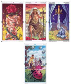 (Рыцарь Куб) Музыка: Королева Пент, 5 Пент, 5 Мечей, Дно Король Куб - Сперва довольно приятная музыка, музыка на волнах житейской мудрости (Пришла мысль как, например, группа Мельница, но определенные песни), По 5 Пентаклей - Музыка передающая состояние некой опустошенности, подавленности, будто призывает задуматься, а туда ли я иду, или шел, а может есть звуки дождя, грозы. 5 Мечей - Мелодия переходит в более ожесточенную, но при этом скорее музыка не трогает за струны души, а в большей степени передает то, что в жизни бывают и трудности, и сложности, и потери.