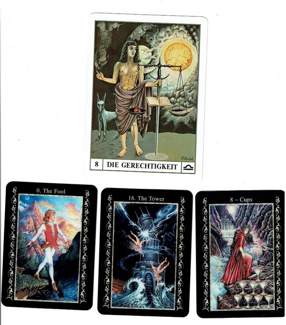 Опять жезлы и самая последняя из них карта 10ж, также подтверждает, что все те проблемы, которые у тебя накопились из прошлого, которые давили и не давали двигаться вперед, они останутся в прошлом; иногда 10ж показывает на одну какую-то серьезную проблему, а иногда и на несколько, но в этом месяце все-таки что-то из них разрешится, потому-что дальше нести этот груз нет ни сил, не возможности, а глядя на 6-ку выше, то это дает надежду, что ты справишься с этой давнишней ситуацией и будешь довольна. 3-ка чаш здесь показывает личные отношения, это может коснуться как отношений между тобой и мужем, так и родных, близких, которые тоже состоят в отношениях; будет урегулирование между парой различных юридических вопросов, таких как свадьба, развод, оформление контрактов и тд, это я как пример привела, а на самом деле спектр у правосудия очень большой и может ни одно из перечисленного не произойдет, а будет что-то другое, но сама карта Правосудие, показывает, что какие то дела в этой сфере тебя могут коснуться. Вот даже и не знаю что сказать. С финанцами ничего нового не было, всё как обычно. И с отношениями тоже. Хотя... у меня двоюродный брат в процессе развода. и я всегда слышала одну сторону, а теперь познакомилась с мнением другой стороны. И понятно, что не понятно и не известно кто прав... Но по правосудию- скорее всего моя учёба показана. Закончила я курс. Сейчас нужно ешё практика и экзамен. Планирую в мае заняться практикой и анализом. Ешё тоже по справедливости что сказать можно: Меня тут обвинила хорошая знакомая в том, чего я не делала. Потом мы разобрались , но такого наезда в жизни не испытывала... Причём несправедливого! Может как то это отразилось..