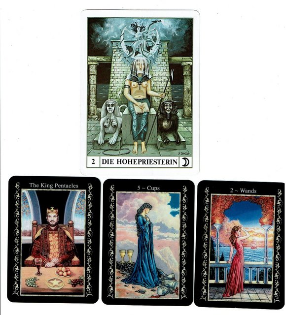 Жрица с этими картами показывает, что вероятно в планах у вас есть намерение обратиться к знакомому мужчине по вопросам денег, хотите у него занять или наоборот, вернуть свои...при этом вы за что-то обижены или разочарованы в нем...опять же, чего-то конкретного здесь не будет, пока только планирование, процесс обдумывания своих действий, много неясного и на исполнение задуманного влияет расстояние ( квинт — Колесница).