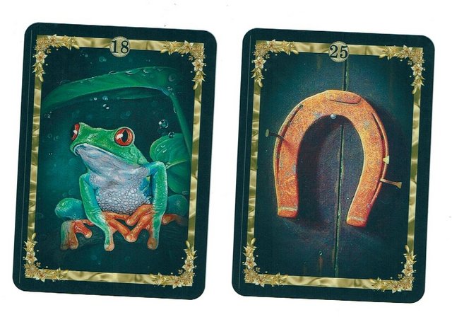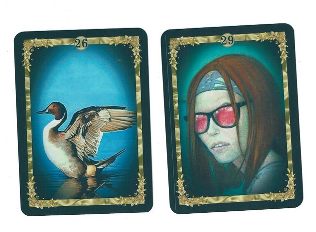 Первая карта показывает обман в отношениях. Рядом находится некто, являющимся не тем, за кого себя выдает. Всем видом показывает вам, что он друг, на самом деле это очень далеко от истины. Вторая карта —розовые очки. Символ, говорящий о том, что ваши глаза закрыты, вам не видно реальное положение вещей и это может иметь неприятные последствия. Вы или обманываете сами себя или являетесь обманутым. Появление этого символа — предупреждение. Будьте внимательны и постарайтесь посмотреть на то, что происходит под другим углом, с иной точки зрения.