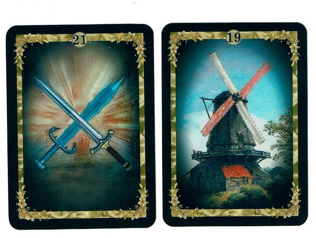 Символы ссор и сплетен. Неприятные для вас пересуды, обсуждение ваших действий. Мельница указывает на то, что некое событие в вашей жизни, которое вы по каким-то причинам хотите утаить, оно может попасть в поле зрения посторонних людей ( коллеги, друзья или даже родственники) и кто-то их них может воспользоваться данной информацией и посплетничать. Обратите внимание, что обе карты почти идентичны, поэтому будьте осторожны в своих словах и действиях, пересмотрите свои позиции, а если сила на вашей стороне, знайте, что кому-то это не по нраву.