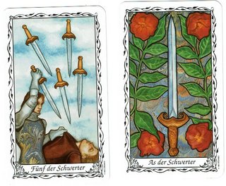 Когда выпали эти карты, то долго на них смотрела... не потому, что какая-то сложность в толковании, а просто когда карты мечей выпадают на отношения, да еще такие номиналы, то это сразу говорит об очень непростых и даже кризисных отношениях между парой. Незнаю, насколько точно карты отразили ваше состояние, но они говорят о том, что в настоящее время вам эти отношения в тягость и вы были бы не против, вообще освободиться от них, потому-что в голове прокручиваются только негативные моменты по отношению к партнеру, может быть он вам когда-то сделал больно, вы не можете забыть и при каждом удобном случае, стараетесь его уколоть, хотя эти карты также могут показывать, что даже разговорное общение между вами напряженное. Вы ощущаете себя в этих отношениях очень болезненно и у вас к партнеру нет никаких чувств, просто есть общение и обсуждение каких-то вопросов, которые требуют решения, а в плане теплоты, любви... этого нет.