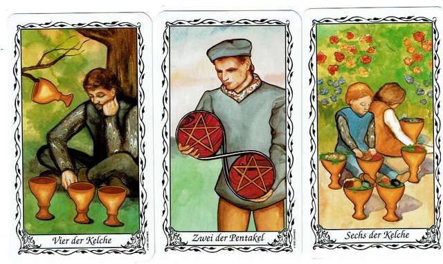 3. Отношения: Эта карта характеризует отношения, сложившиеся между вами на данный момент, и показывает вам, какие полезные выводы вы можете сделать из вашего нынешнего жизненного опыта. - 4 чаши, 2 пент, 6 чаш