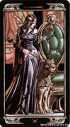 На картине мы видим официальную церемонию женщины получения императорского статуса ( Правосудие+Императрица); туз пентаклей вместе с Императрицей могут показывать на пышность и богатство этой церемонии, а так же на абсолютную власть, которая достанется этой даме после коронации.