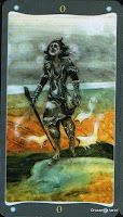 Моё видение Шута, Шут близок к классике в этой карте. Лицо, его выражение мне напоминает детское, некая наивность, одухотворенность бросается в глаза. Интересно, что одежда в серых тонах, без яркого цвета, может быть Шут уже не связан с материальными интересами, страстями, он всё воспринимает ровно. На одежде отображены птицы, животные, то есть некая связь с природой, жизнь в ритме природы, дитя природы. За ним следуют существа, которые хотят его укусить, но он их не видит, он в своем мире, глубоко в себе, в то же время трость служит для него некой опорой, как связь с землей, за ним остаются луга, поля, он уходит от мирских забот, уходит в никуда за своей мечтой, бросая дом, семью любые связи. Спускаясь с горки он даже не смотрит под ноги, он где то там, но не здесь. Ощущение, что идёт в медитативном состояние, не осознавая мир вокруг себя.