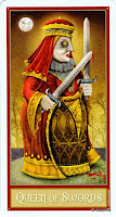 Победоносная стойка королевы жезлов, в ослепительном сиянии полнолуния - не что иное, как показатель победы !Да и луна гармонична. Нет на ней изображения куда-то зовущего лица - значит цель достигнута! Королева мечей - показатель осознанности действий, осознанности возможной боли и потерь, и, готовность к этому. Здесь, Луна зовёт, призывает к действию. Вся внутренняя сущность человека понимает, что время пришло.